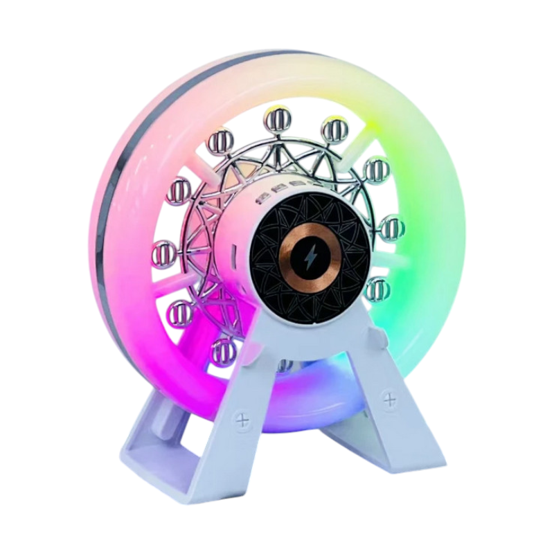 Ασύρματο ηχείο Bluetooth σε εντυπωσιακό σχεδιασμό ρόδα λούνα παρκ, με φωτισμό LED και μοντέρνο design που μπορεί να λειτουργήσει και σαν διακοσμητικό χώρου, ενώ με τον πολύχρωμο φωτισμό του δημιουργεί μία μαγική ατμόσφαιρα.