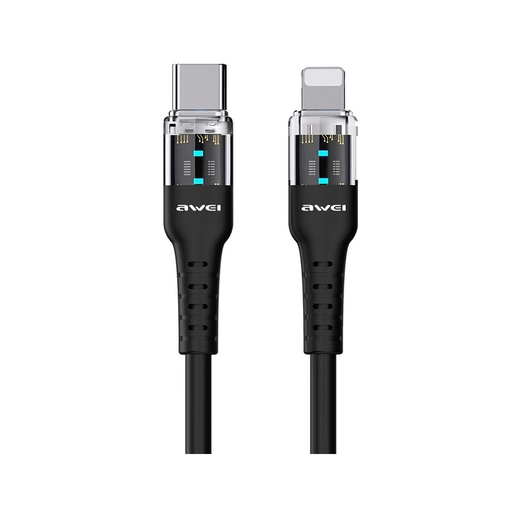 Καλώδιο μεταφοράς δεδομένων USB Type-C σε Lightning της AWEI, με πρωτοποριακό διαφανή σχεδιασμό και ταχύτατη απόδοση.