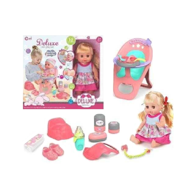 Κούκλα μωρό με καρεκλάκι φαγητού και πλήρες σετ αξεσουάρ φαγητού και φροντίδας για να φροντίσεις την κούκλα σου σαν ένα πραγματικό μωράκι!