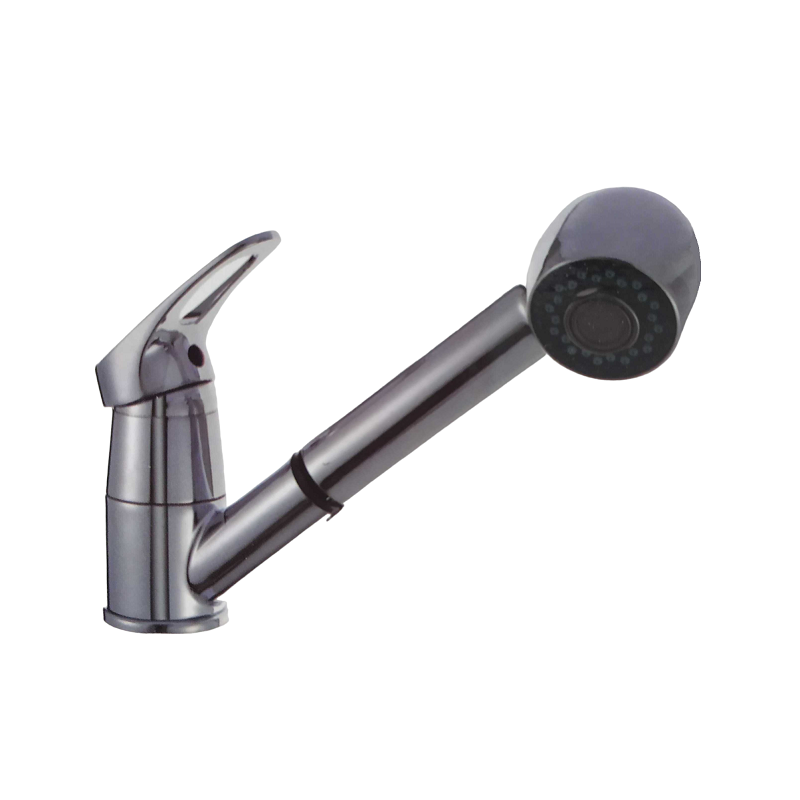 Μπαταρία βρύσης κουζίνας με ρυθμιζόμενη κεφαλή που επεκτείνεται με εσωτερικό σπιράλ, για εργονομικό χειρισμό.