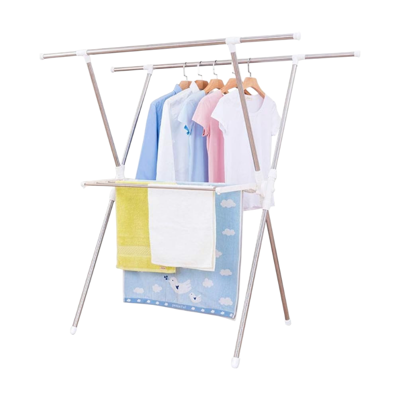 Πτυσσόμενη κρεμάστρα δαπέδου διπλή και απλώστρα ρούχων πολλαπλών χρήσεων. Μεταλλικός σκελετός. Ρυθμιζόμενο μήκος βέργας. Διαστάσεις: 98-155 x 68 x 132 cm.