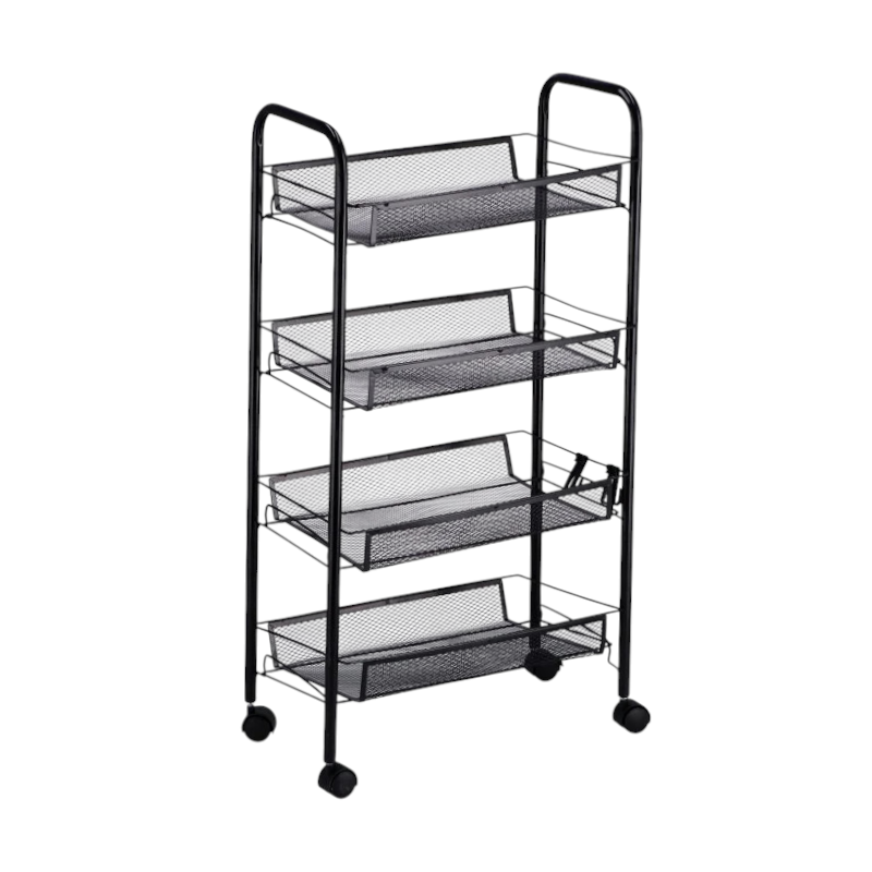 Μεταλλική, τετραώροφη ραφιέρα-μανάβης, τρόλει για εύκολη μετακίνηση.