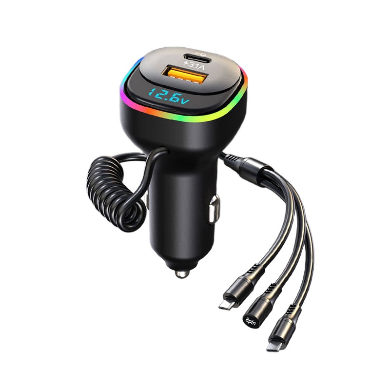 Υψηλής απόδοσης USB φορτιστής αυτοκινήτου με βολτόμετρο και τριπλό καλώδιο: USB Type C, MicroUSB και Lightning. Εξαιρετικά ανθεκτικός και συμβατός με όλες τις συσκευές που φορτίζουν μέσω USB θύρας.